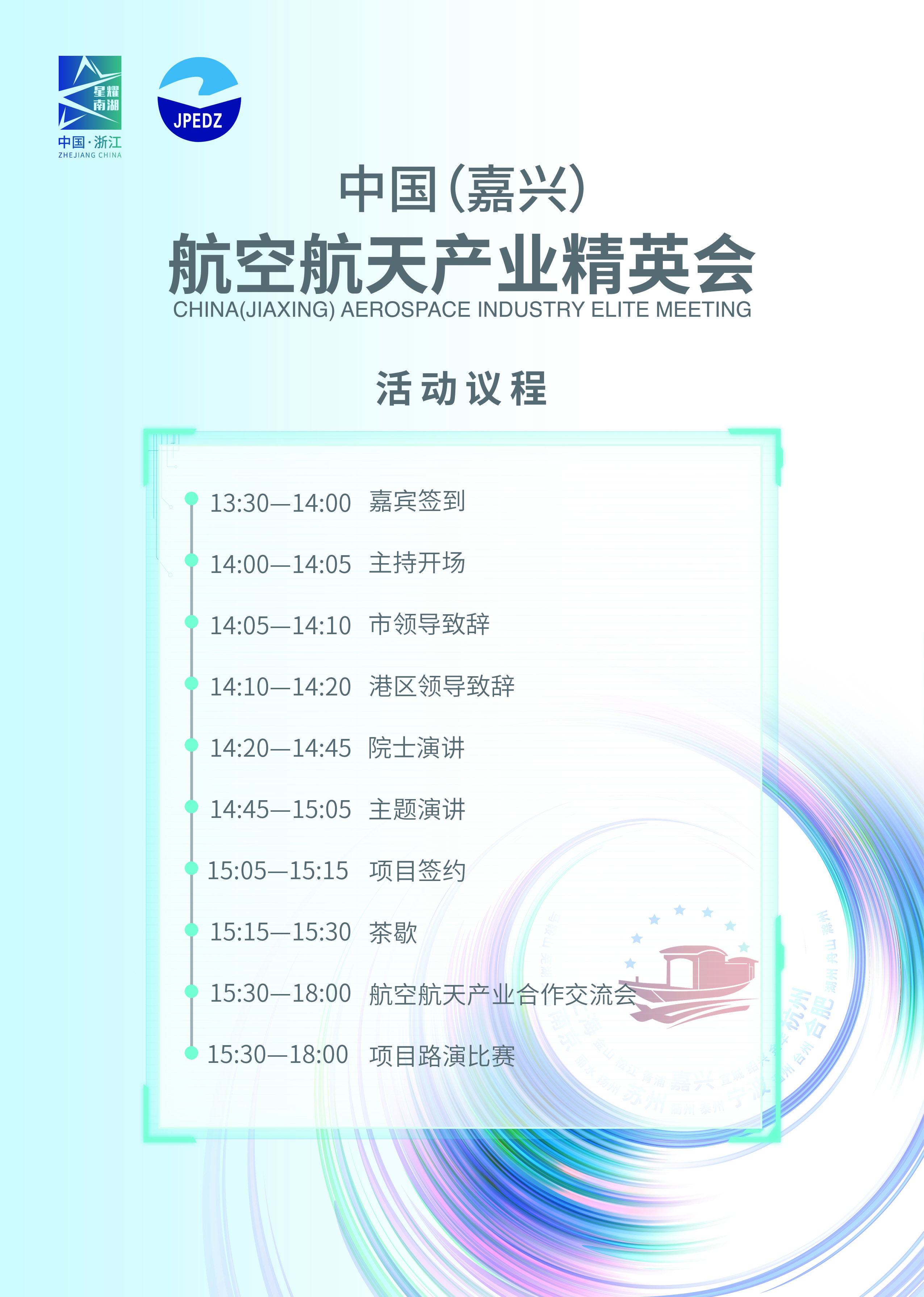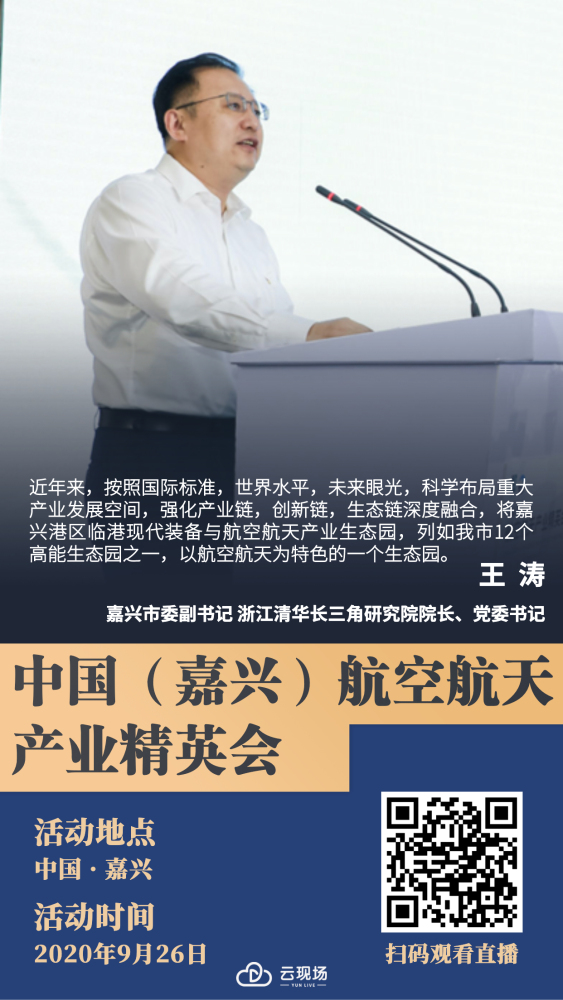 为更好地融入长三角一体化发展,进一步推进航空航天产业发展以及人才集聚,营造良好的航空航天创业创新氛围,根据2020中国浙江“星耀南湖·长三角精英峰会”总体部署,9月26日嘉兴港区举办“中国(嘉兴)航空航天产业精英会”。同期将举办嘉兴港区第三届创业创新大赛航空航天专场赛。