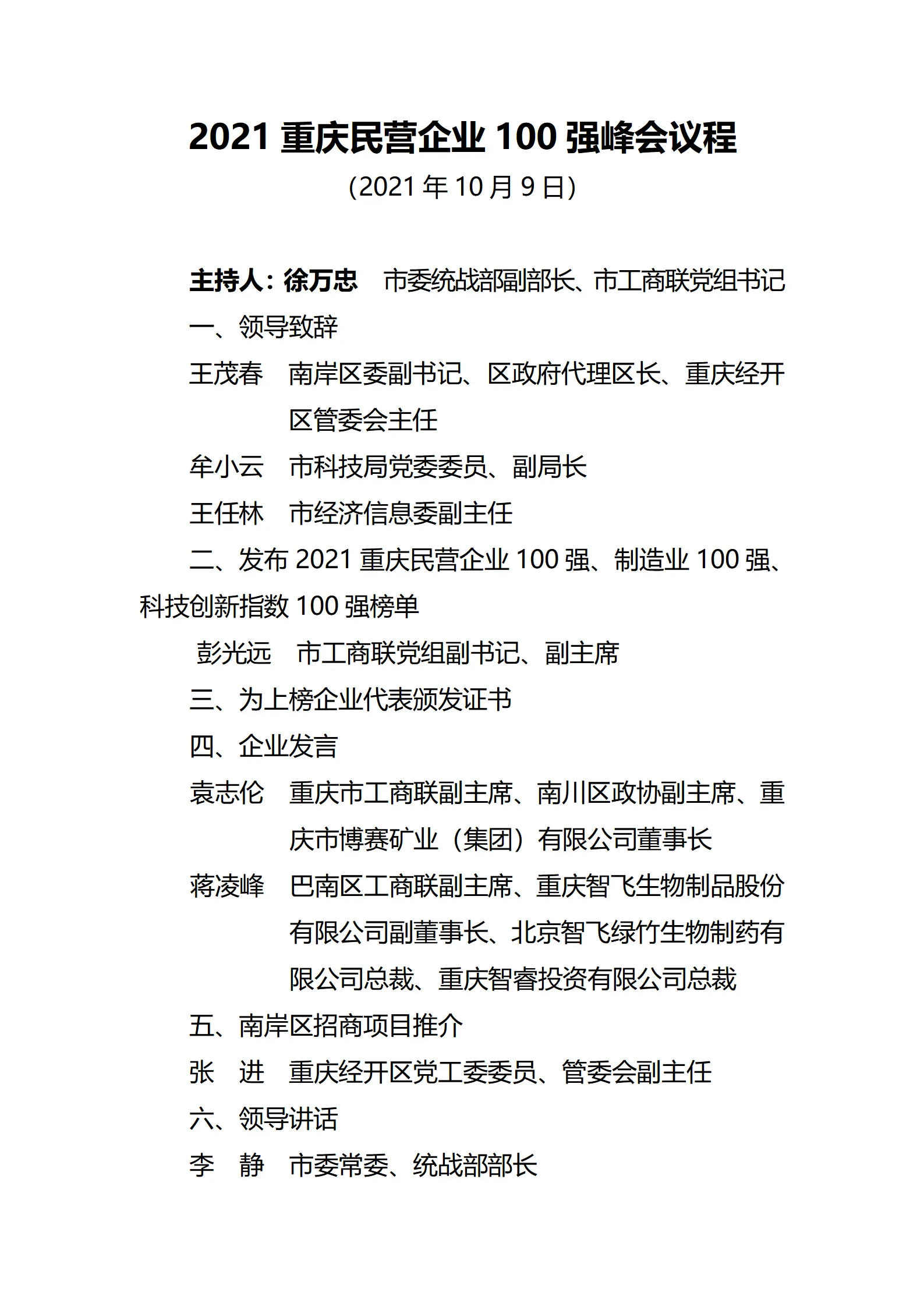 本次2021重庆民营企业100强峰会由重庆市工商联、重庆市科技局、重庆市经济信息委主办,重庆市市场监管局、重庆市商务委、重庆市乡村振兴局、重庆经开区管委会、重庆富民银行作为支持单位共同发布。此外,为贯彻市委五届十次全会和全市推动制造业高质量发展大会精神,与重庆民营企业100强同时发布的还有制造业民营企业100强榜单和民营企业科技创新指数100强榜单。