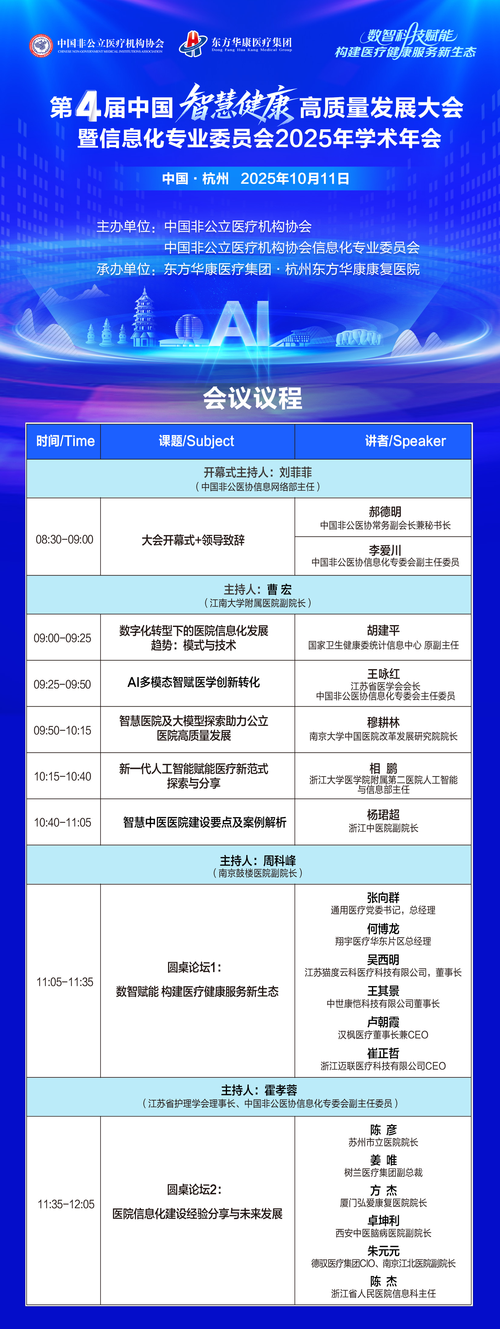 为深入探讨智慧健康领域的最新进展,促进学术交流与合作,共同推动我国社会办医信息化、智慧化高质量发展,第四届中国智慧健康高质量发展大会暨信息化专业委员会2025年学术年会10月10-11日在浙江省杭州市召开,会议以“数智科技赋能,构建医疗健康服务新生态”为主题,汇聚行业知名专家、学者、全国医疗机构院长及信息化负责人,围绕智慧健康领域的最新技术、发展趋势和实践应用等相关话题进行交流与热烈研讨。