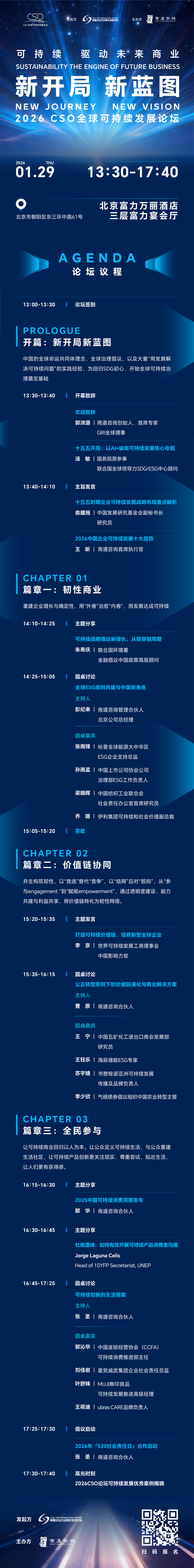 1月29日,由思盟企业社会责任促进中心发起、商道咨询主办的 2026CSO全球可持续发展论坛将在北京隆重举行。本届论坛以 “新开局 新蓝图——可持续,驱动未来商业” 为主题,汇聚来自政府部门、联合国机构、智库及全球企业经理人代表,围绕企业ESG高效治理、供应链协同创新、可持续生活创意三大核心议题,共同探索可持续商业的价值驱动和创新方案。届时,2026CSO论坛可持续发展优秀案例评选结果也将在论坛当天揭晓。